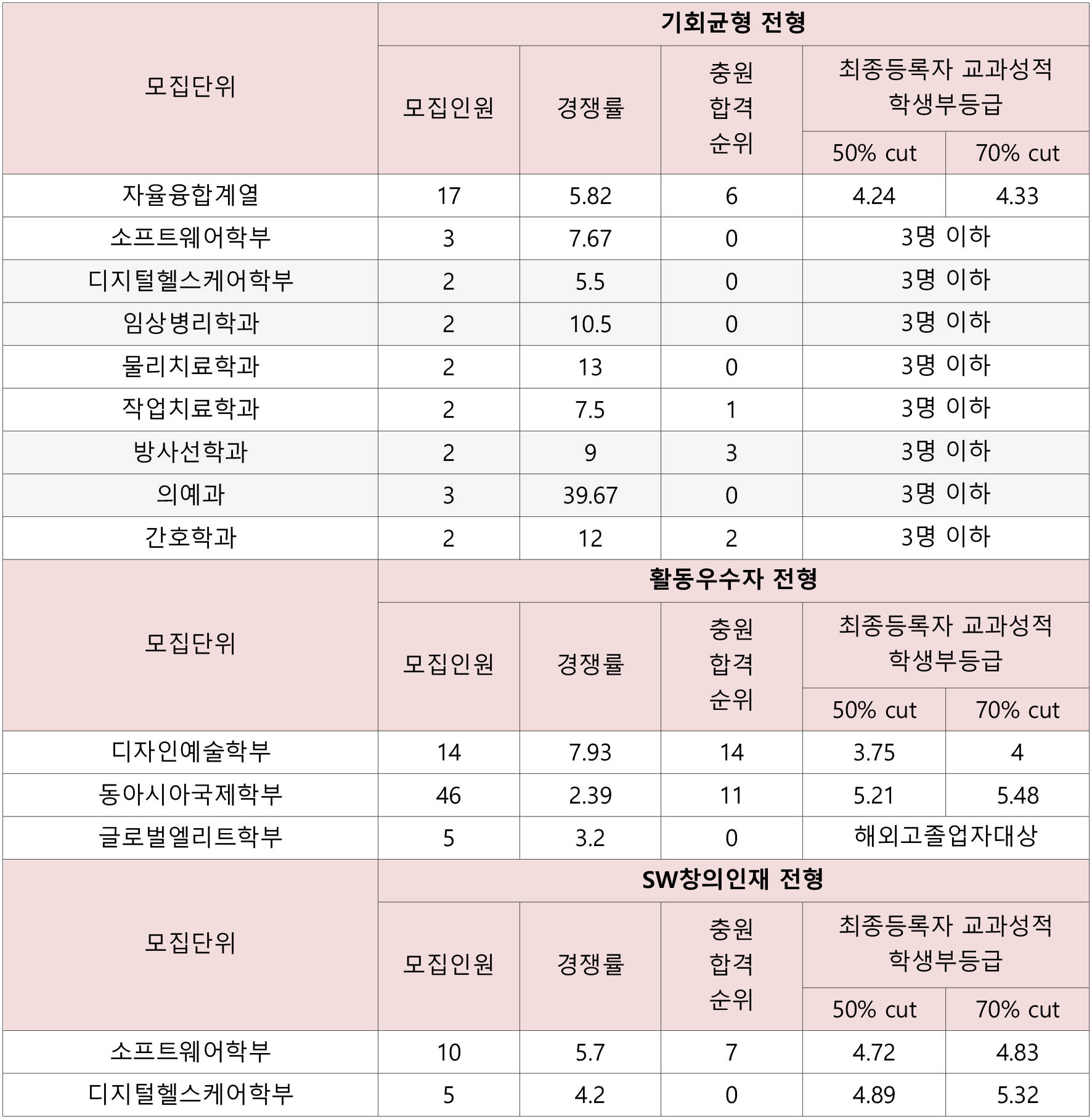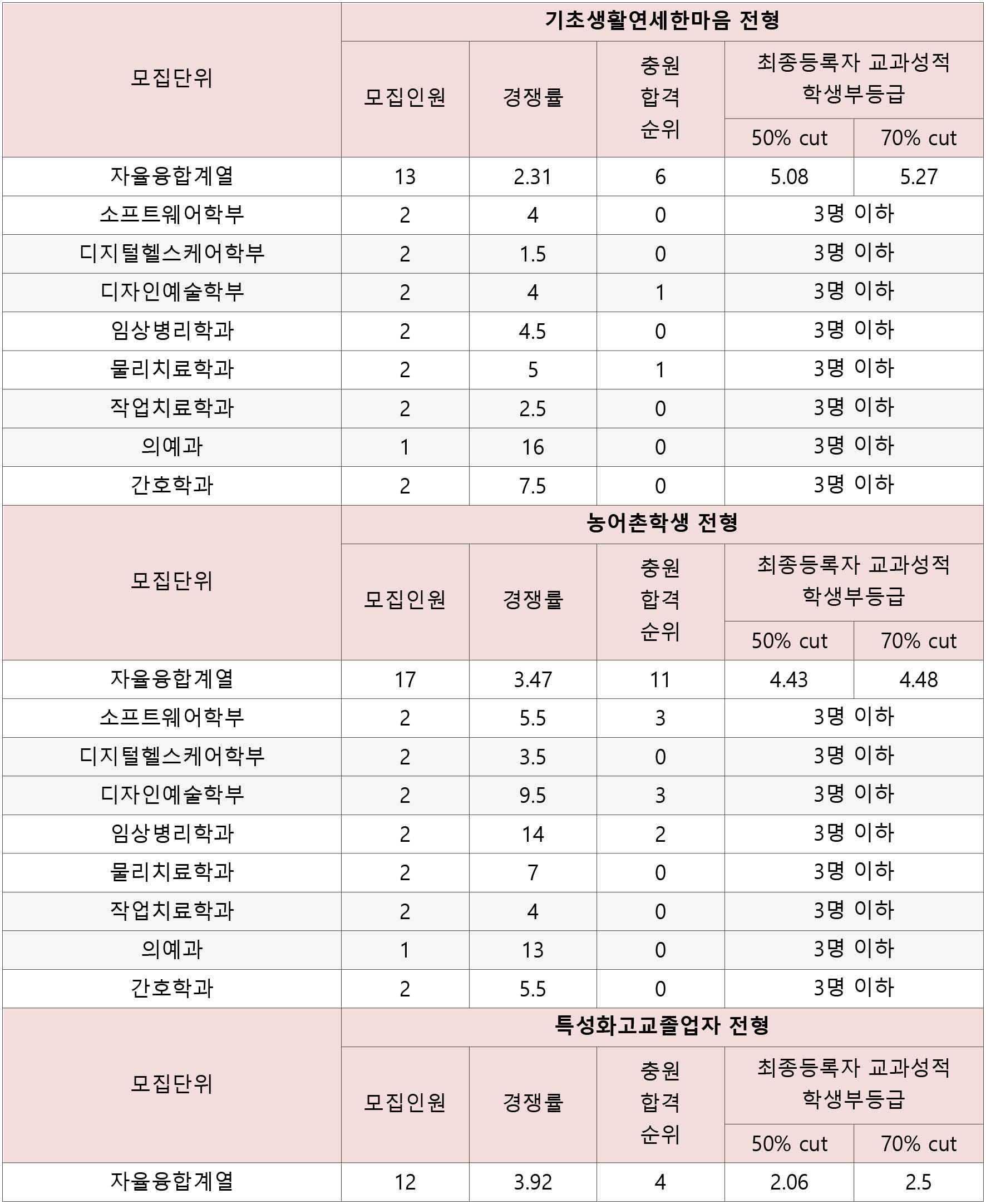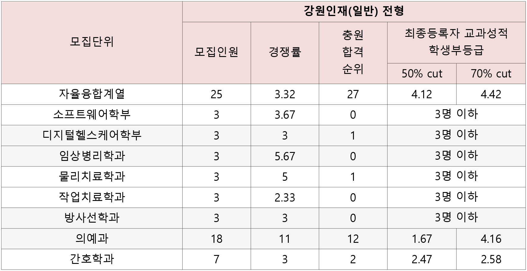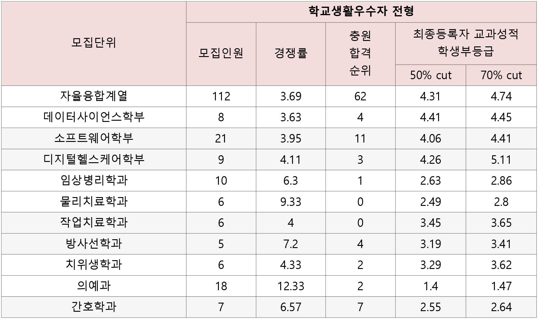 의예과 1.3 임상병리학과 2.35 간호학과 2.43 물리치료학과 2.48 방사선학과 2.66 - 3.01등급~